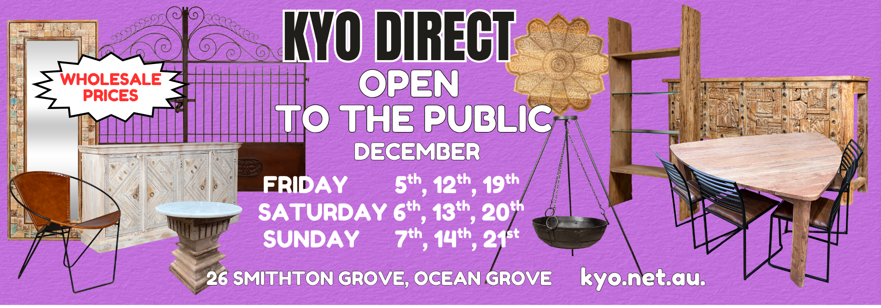 The term ‘KYO Furniture Warehouse’ or ‘us’ or ‘we’ refers to the owner of the website whose registered office is 26 Smithton Grove, Ocean Grove, Victoria. 3226. Our ABN is 37104812295. The term ‘you’ refers to the user or viewer of our website.