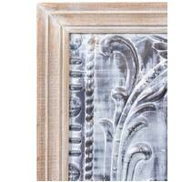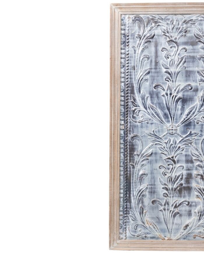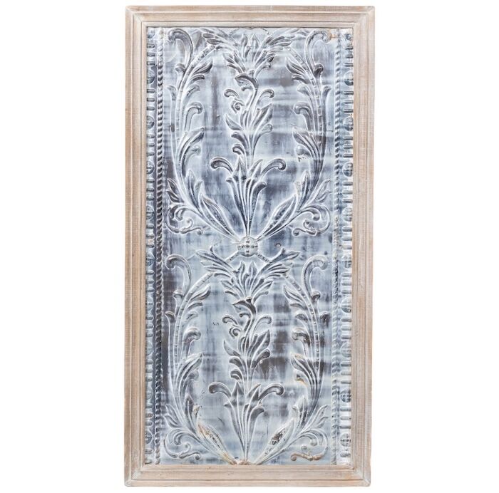 Pressed metal ceiling panel in a timber frame. Can be hung both vertically and horizontally so ideal as both a bedhead or artwork.