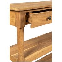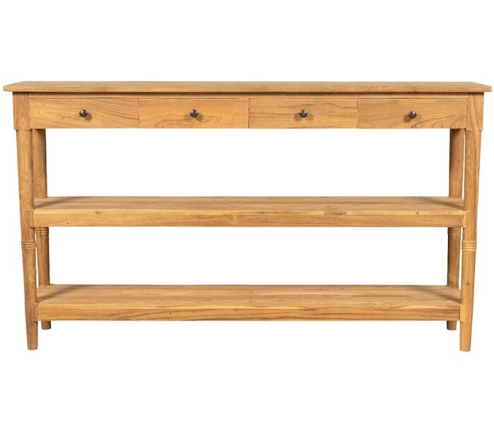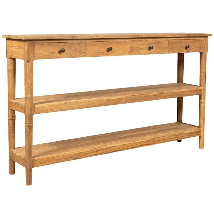 Solid teak wood console / hall table with 4 drawers and 2 shelves providing ample storage.