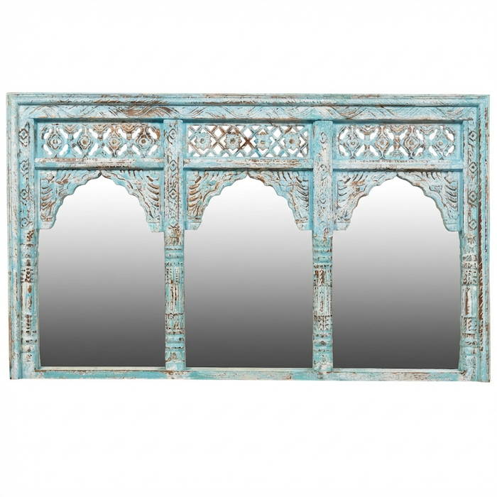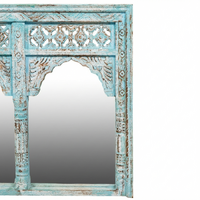 Solid timber mirror with a beautifully carved frame. Finished in a distressed blue paint.