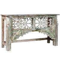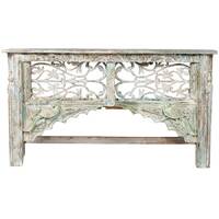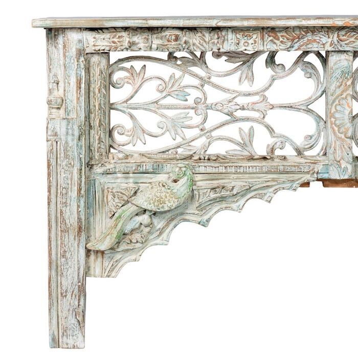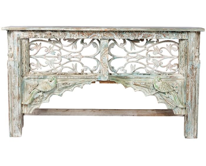 Solid timber console with a beautiful cast iron panel and vintage carved timber bird details in a distressed blue painted finish.