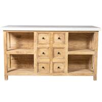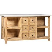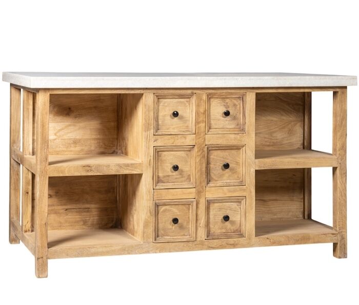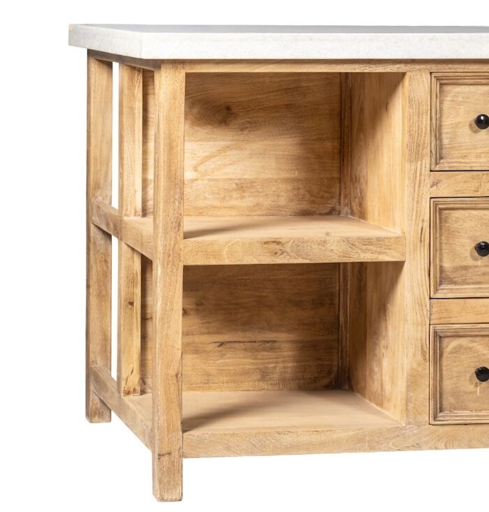 Polished white marble top on a solid acacia timber kitchen island bench. 6 drawers and shelving, with a breakfast bar on the other side.