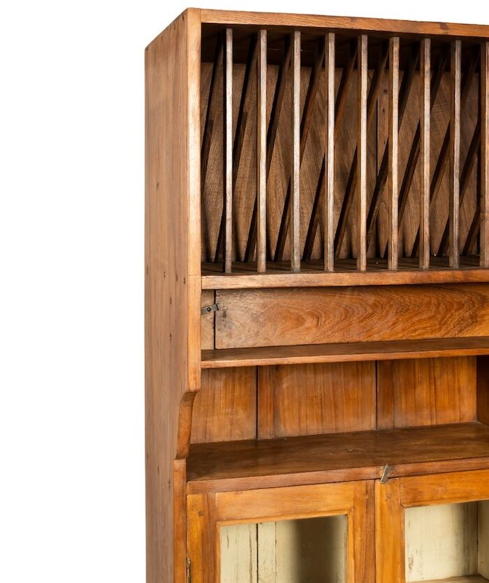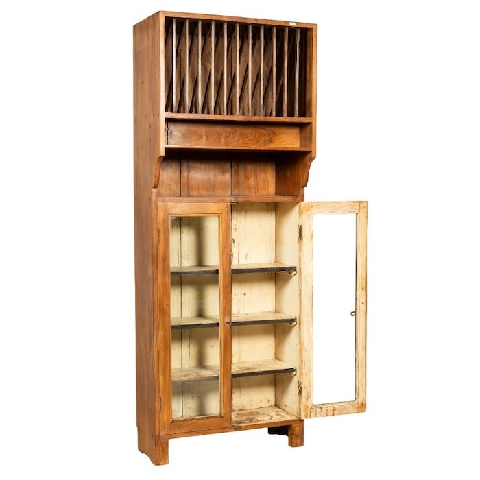 Solid timber vintage kitchen cabinet with glass doors and plate rack.
