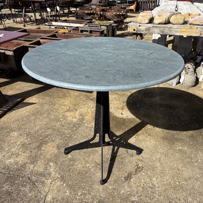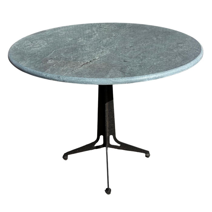 Round dark green marble table top on a heavy cast iron pedestal base.