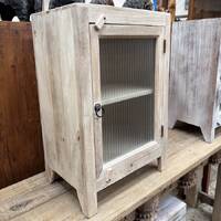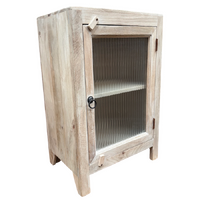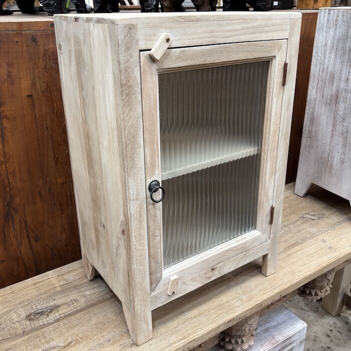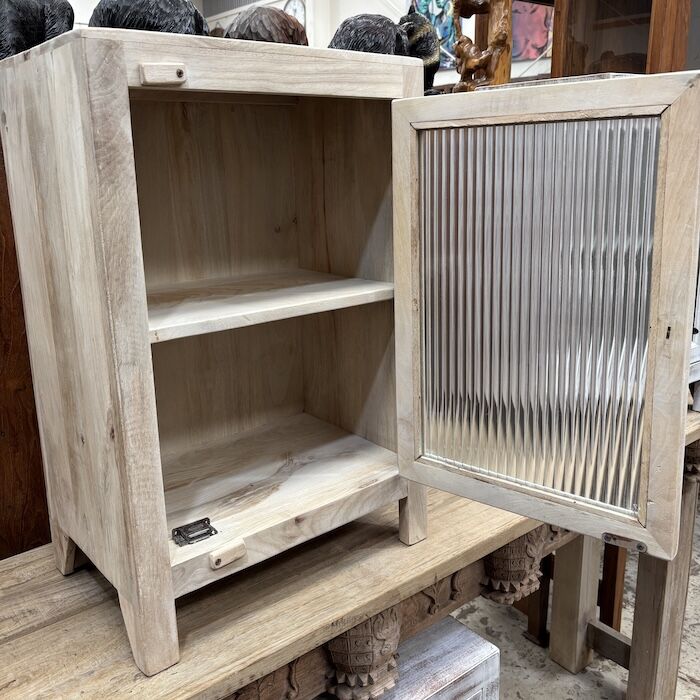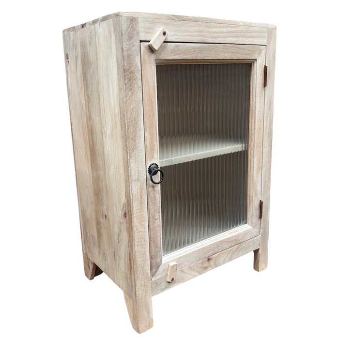 Solid timber bedside with a fluted glass door.
