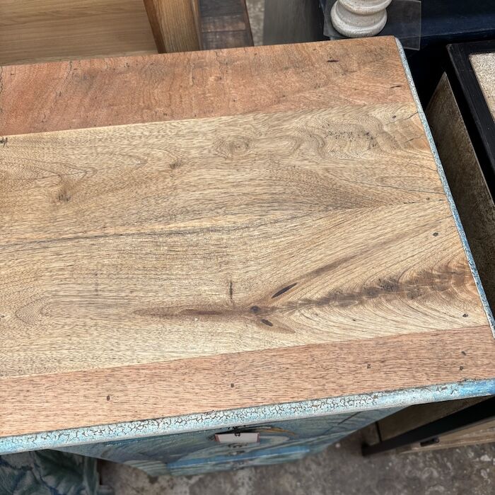 Tall bedside drawers with a beautiful bird painting, finished in a unique cracked texture.